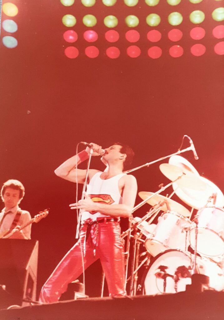 El nerviosismo se acrecienta cuando sale la figura del conductor designado anunciando que en unos minutos se apagarán las luces y luego comenzará la fiesta. Una voz confiable e inconfundible que nos había acercado el legado de los Beatles, noche a noche, al sintonizar Del Plata; la misma figura que después, por la tele, nos incentivaba a pensar musicalmente desde “Implosión”, un programa de música en imágenes, cuando aún no existía la todopoderosa MTV; compitiendo en la emisión de los primeros videoclips con otro programa de ATC en el que, como mueca irónica en medio de una dictadura feroz, desde la TV pública, preferían incentivar la grieta con la consigna: “Votá: ¿Kiss o…? Los ganadores de aquella compulsa popular tocaban para nosotros esa noche. Juan Alberto Badía aseguraba “¡Queen está en Rosario!”. Las primeras explosiones y sonidos atronadores invaden el espacio, una parrilla de luces multicolores se enciende y, más allá de sorprender, como nave extraterrestre de aquel film de Spielberg posándose a la vera del río, nos remite a la magnitud en pantalla grande de Encuentros cercanos del tercer tipo. Los efectos se difuminan por un humo cada vez más denso que invade el lugar, preludiando los primeros acordes eléctricos desde aquel mítico instrumento que el guitarrista construyera artesanalmente junto a su padre y que con el tiempo conoceríamos que hasta tenía un nombre propio: The Red Special Guitar. Se agregan las cuatro cuerdas que sostienen el compás, amplificado por una ingeniería diseñada por el propio bajista. Ya suena en vivo una rotunda versión acelerada de We will rock you. El frontman, vestido desafiante de furioso cuero rojinegro en pantalón y campera, empina el micrófono apretado en su puño como presentador de box, saluda en español entre el griterío de la audiencia y anuncia que comienza el rocanrol, mientras que a mí, un outsider en los pagos de Arroyito, se me infla el pecho de la emoción leprosa, también por ver esos colores moviéndose frenética a la vez que armónicamente por toda la escena.